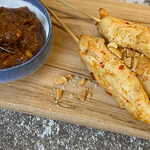 - Sæt kyllingestykkerne på træspyddene.